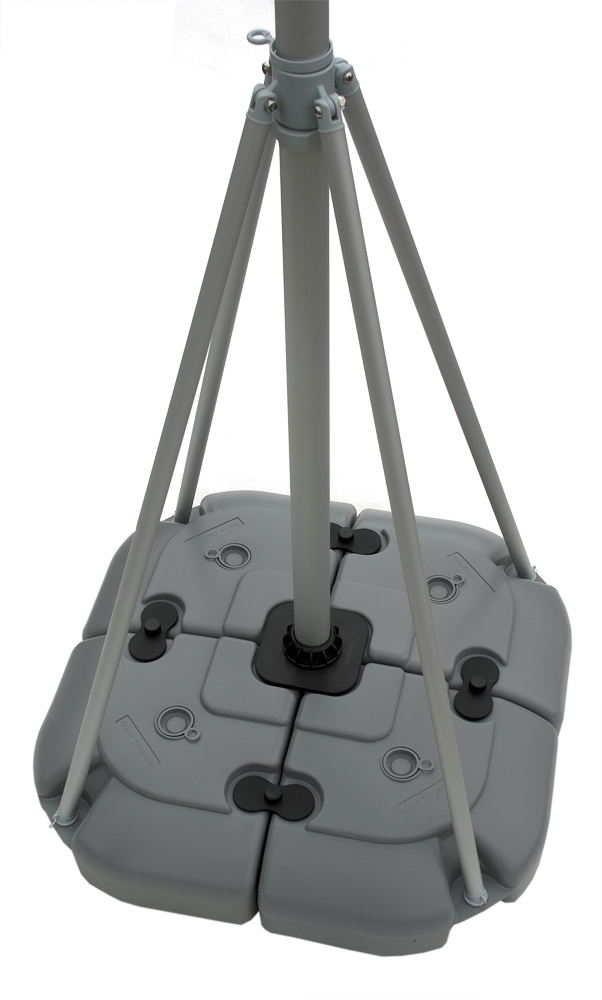 Der Standfuß aus Kunststoff wird mit Wasser oder Sand befüllt und garantiert so eine hohe Standfestigkeit.